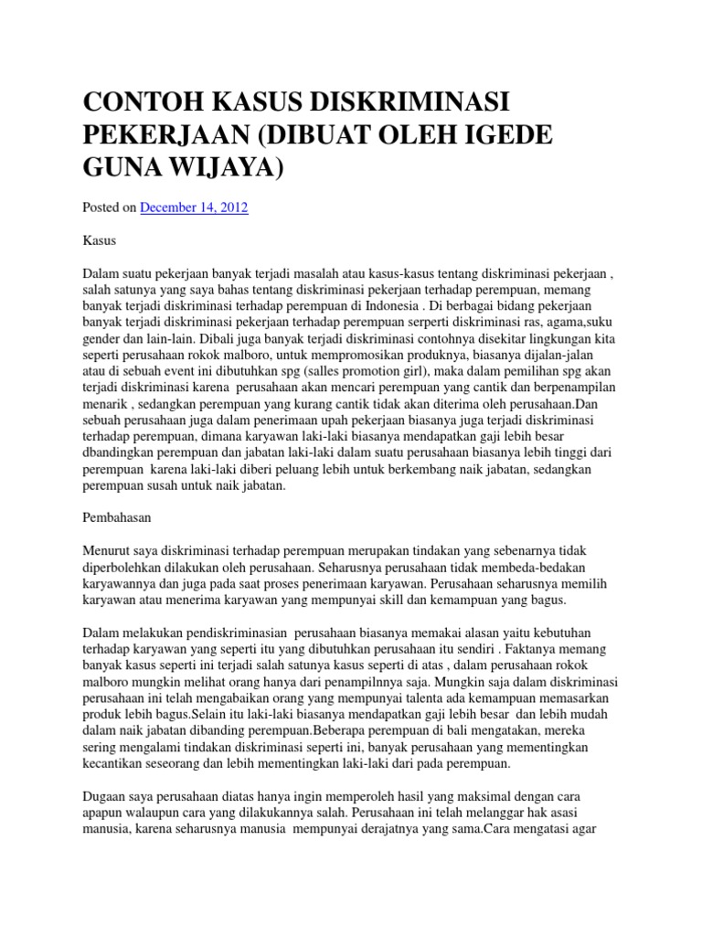 Komisi hak asasi manusia malaysia (suhakam) mengatakan konvensi ini melarang segala bentuk diskriminasi etnis, ras dan lainnya. Pelayanan berbeda atas fasilitas umum (misalnya seperti fasilitas kesehatan) terhadap masyarakat yang kaya serta juga masyarakat yang kurang mampu. Menurut laporan daripada kementerian sumber manusia mendapati 13 daripada 88 hotel di semenanjung malaysia menetapkan dasar standard grooming yang melarang pekerja wanita bertudung. Savesave contoh kasus diskriminasi gender di malaysia for later. Dalam perilaku sosial merujuk kepada pelayanan yang tidak adil terhadap individu tertentu, di mana layanan ini dibuat berdasarkan karakteristik yang diwakili oleh individu tersebut.
