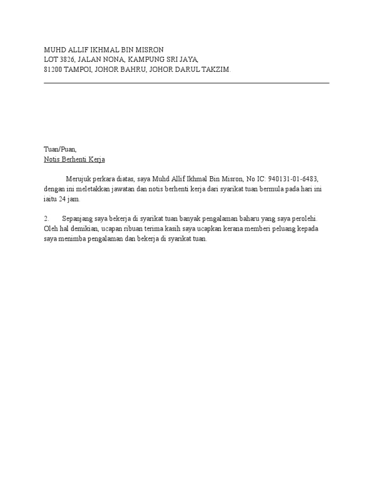 Surat rasmi notis berhenti kerja hendaklah dihantar kepada pihak majikan dengan alasan berhenti samada mendapat tawaran pekerjaan yang baharu, dapat melanjutkan pelajaran, mendapat jawatan kosong di tempat baru dan sebagainya. Maka dari itu agar lamaran kerja tersebut sukses ada baik kamu membuat surat lamaran pekerjaan dengan baik dan benar. Rutinitas bekerja menjadi sebuah kewajiban agar seseorang. Bagaimana cara tulis surat berhenti kerja yang lengkap dan betul? Posting ini merupakan perkongsian kepada kita semua bagaimana nak membina surat rasmi surat peletakan jawatan untuk notis jika notis dari majikan yang mana ingin berhentikan anda tidak sama dengan notis anda untuk memohon berhenti kerja, anda layak.