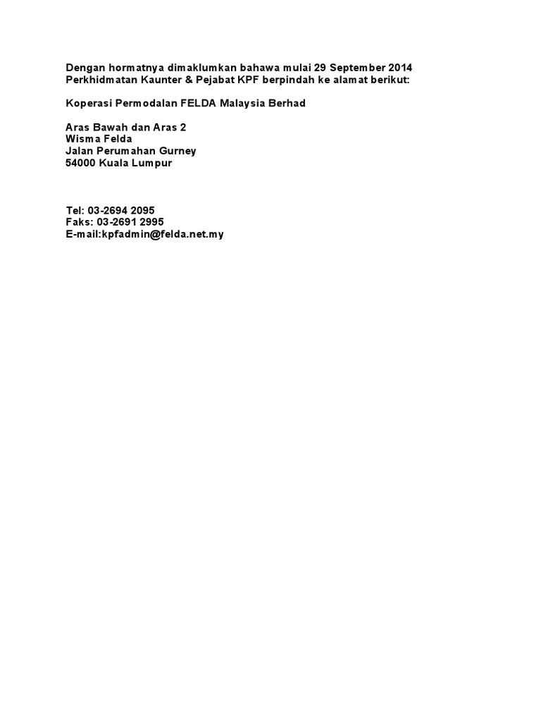 Notis Penangguhan Mapt 39 Kpf Koperasi Permodalan Felda Malaysia Berhad from kpf.dyndns-web.com Koperasi kakitangan felda malaysia berhad, tingkat 18,menara felda,platinum park. See full list on klse.i3investor.com B est viewed using ie version 7.0 on wards on the resolution of 1024 x 768. Hmp felda tun ghafar hutan percha. Koperasi permodalan felda malaysia 2 berhad tingkat 1, balai felda, jalan gurney 1, 54000 kuala lumpur, malaysia. No 11 persiaran klcc, 50088 kuala lumpur malaysia. Koperasi permodalan felda malaysia berhad 2011. Dec 28, 2016 · koperasi permodalan felda malaysia berhad.